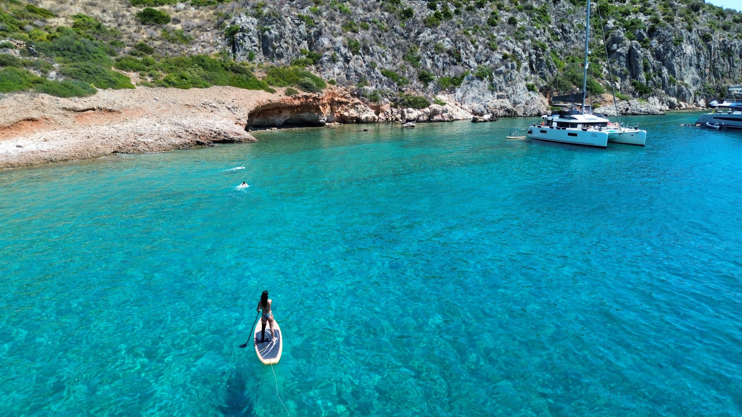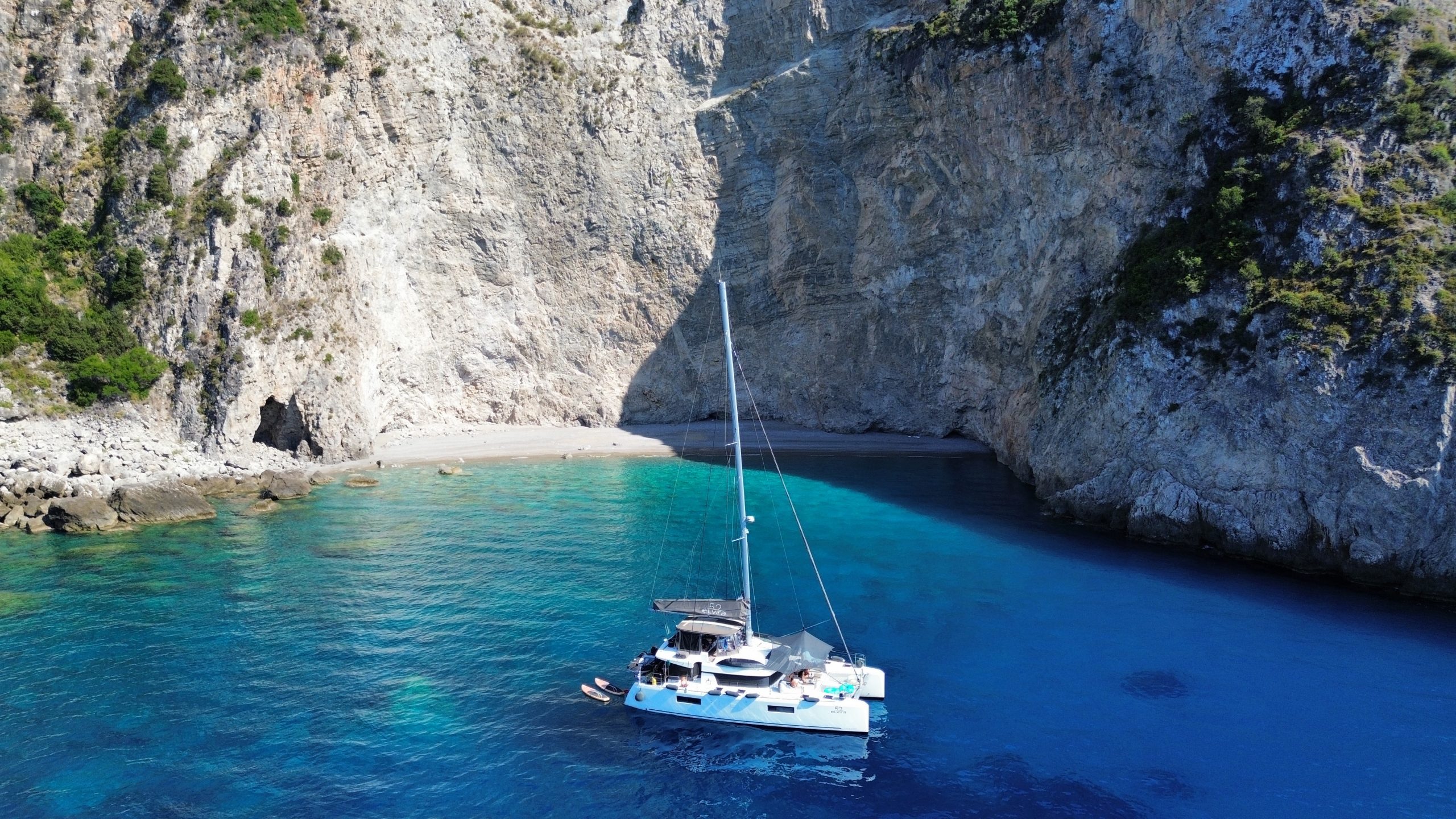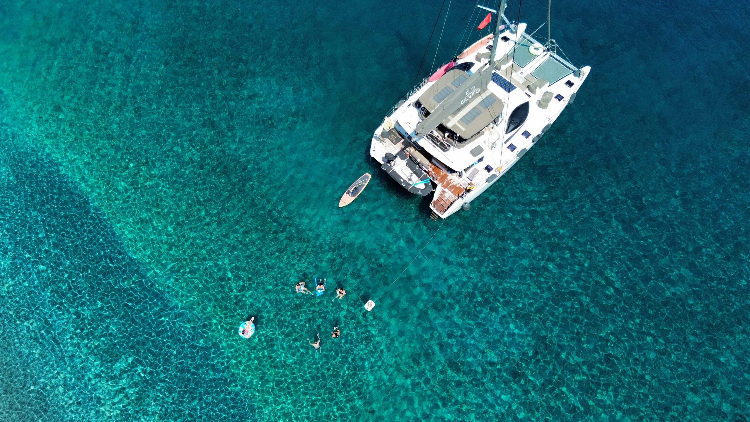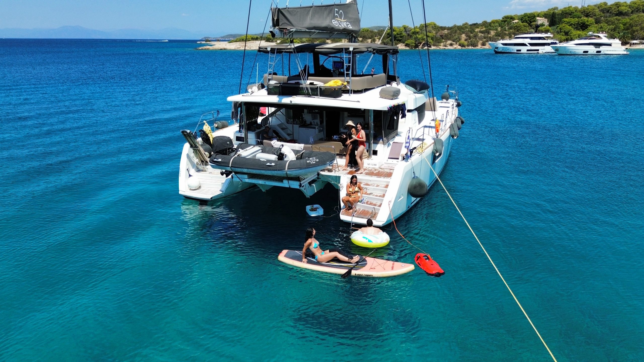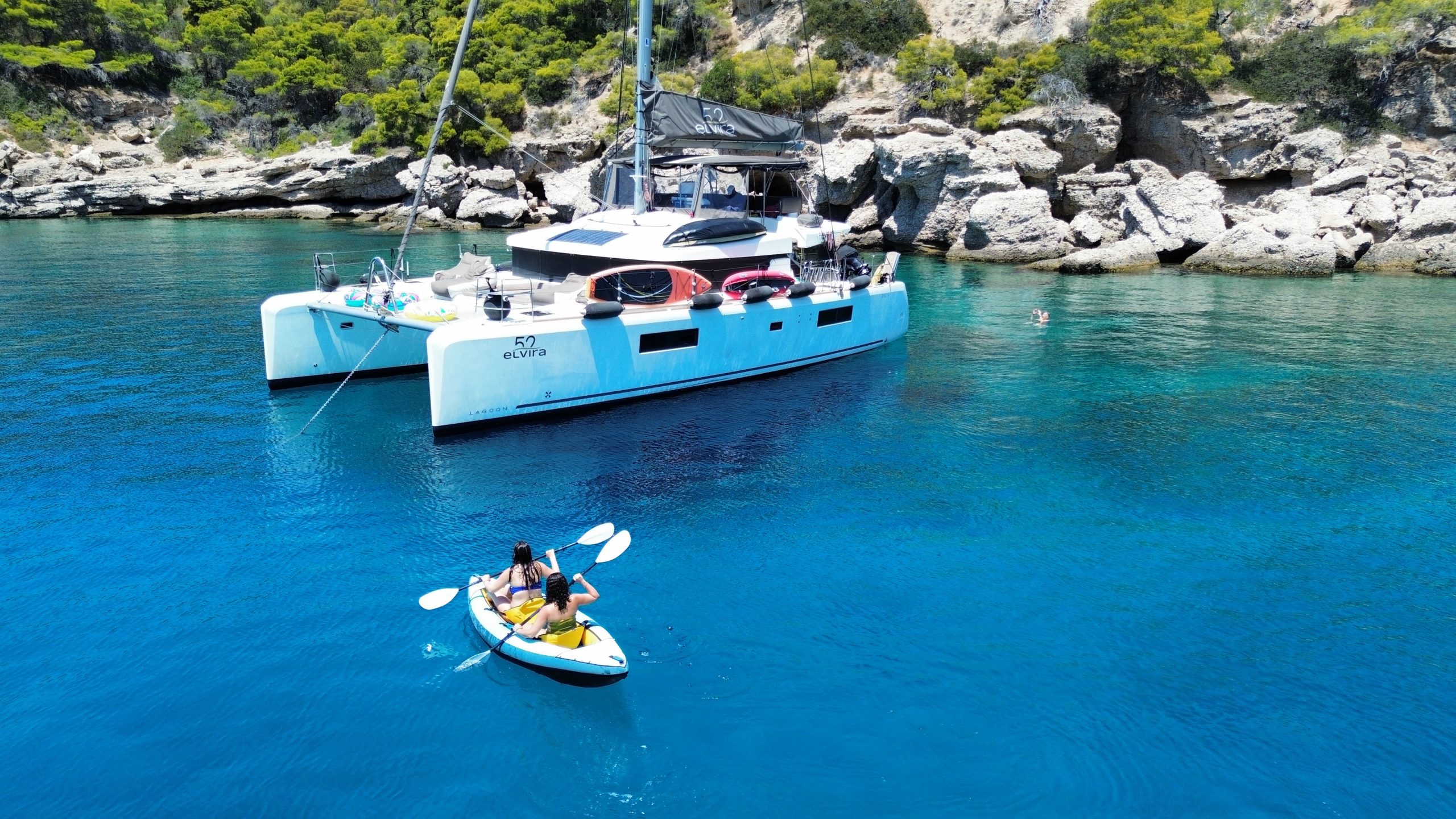 Introducing Our Flagship Yacht – The Lagoon 52 ‘ELVIRA 52’. Step aboard the Lagoon 52 ‘ELVIRA 52’, a distinguished yacht built in 2019 and fully refitted in 2025. As one of the finest vessels in our fleet, it offers an exceptional level of luxury, featuring five elegantly appointed guest cabins and world-class amenities, ensuring a five-star experience on the water. Designed for both comfort and performance, this yacht boasts a remarkably spacious layout, impressive cruising speeds, and a sophisticated forward lounging area—perfect for unwinding while admiring the breathtaking scenery of the Greek seas. The expansive flybridge provides uninterrupted panoramic views, enhancing every moment of your journey. For those seeking adventure, ELVIRA 52 offers a diverse selection of water sports and recreational equipment. Guests can indulge in supreme comfort with queen-size beds, premium linens, powerful air conditioning in all cabins and the saloon, and generously sized bathrooms with separate shower areas. Additionally, a variety of themed evenings and unique onboard experiences elevate your voyage to an unforgettable level. A full list of the yacht’s exclusive features and amenities can be found in the presentation below.Interior